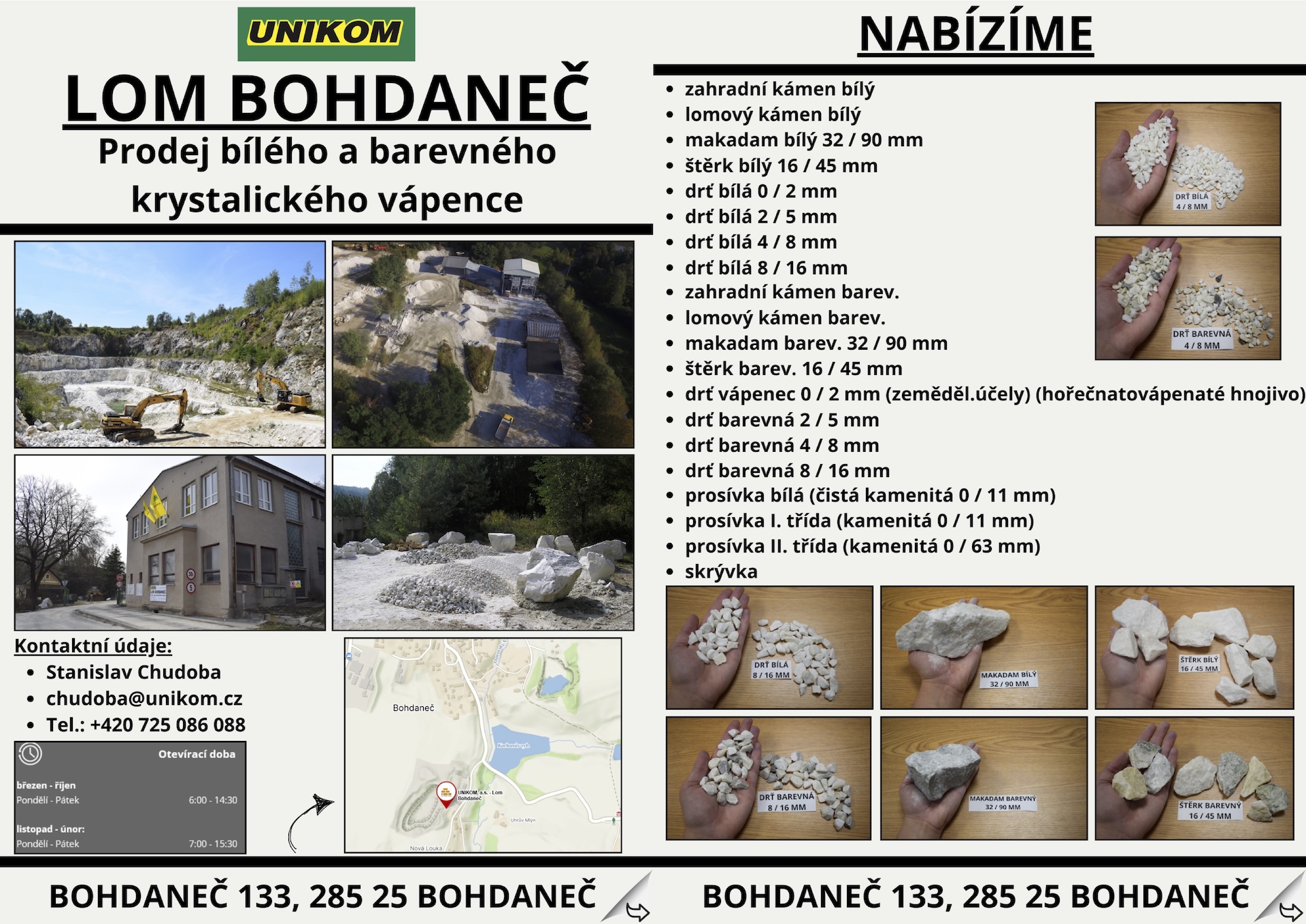 Těžíme a zpracováváme bílý a barevný krystalický vápenec , který je možno využít ve stavebnictví, pro lité teraco, pro maltové přísady, v zemědělství na vápnění, dále pro zahradnické účely a jako dekorace (mramor).